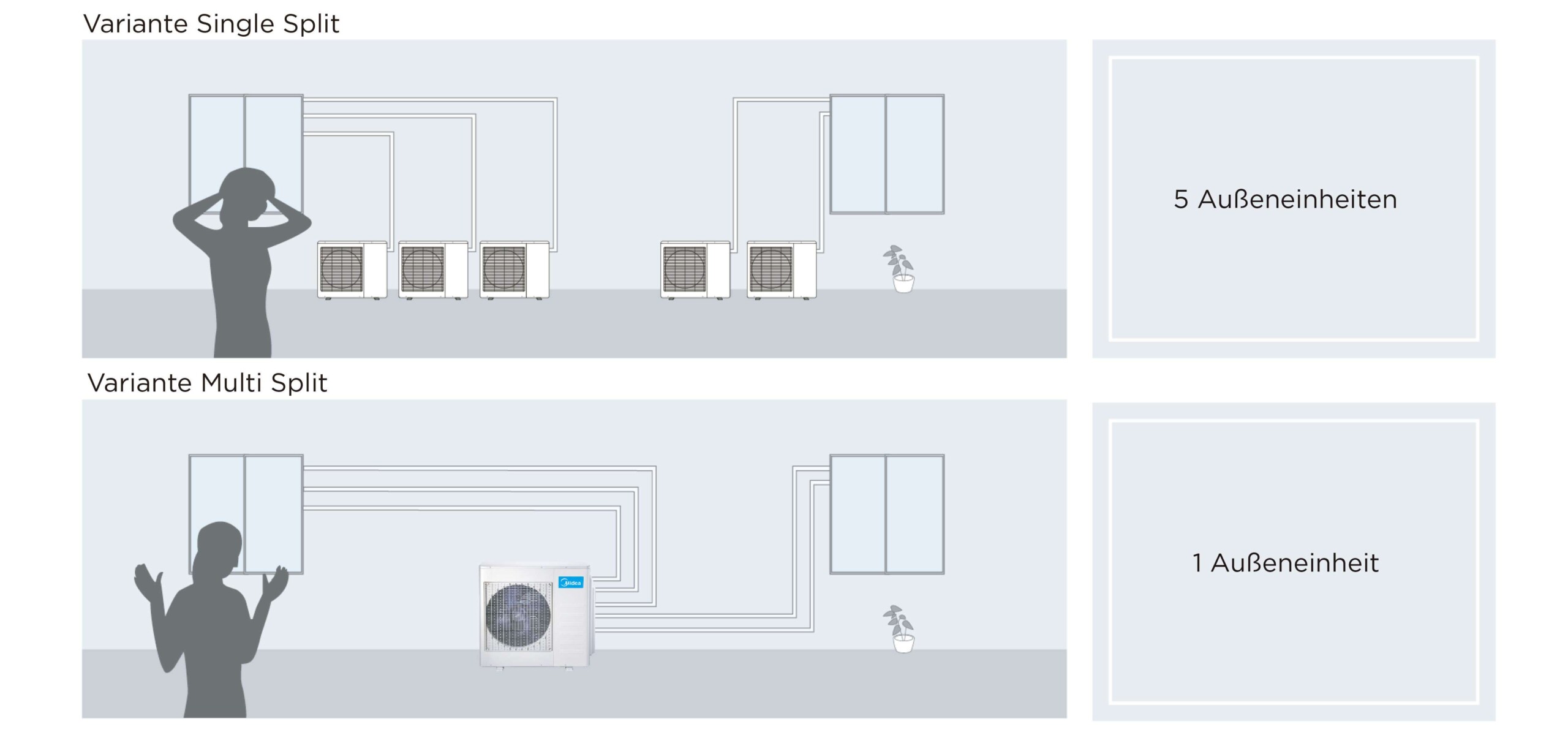 • Diese Systeme ermöglichen die Kombination von bis zu fünf Inneneinheiten an einer Außeneinheit. Bauform und Leistung der Inneneinheiten sind flexibel wählbar, um eine individuelle Klimatisierung zu gewährleisten.