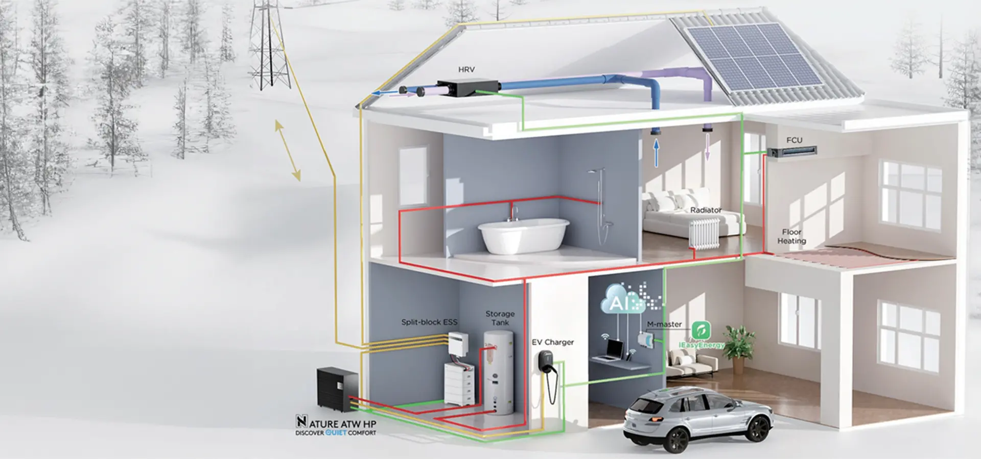 Die M thermal Nature Wärmepumpe ermöglicht das Heizen und Kühlen im ganzen Haus und lässt sich dank  der Midea Nature Serie ganz einfach mit anderen Energiemanagement-Komponenten kombinieren und steuern.