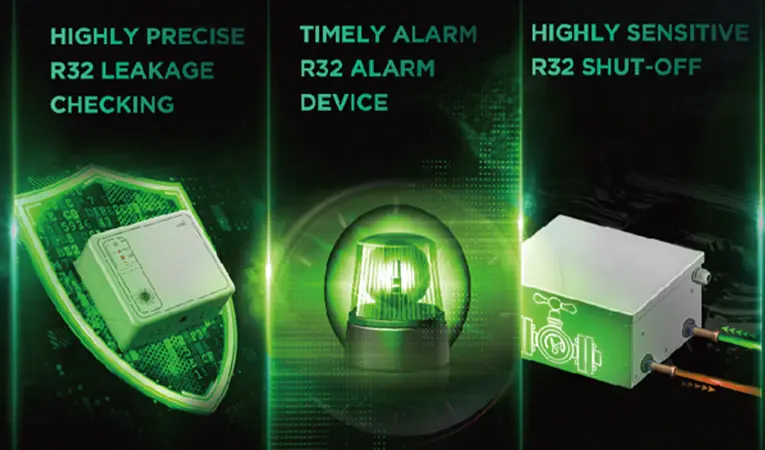 Alarmeinrichtung: Wenn ein Kältemittelleck im System erkannt wird, warnt die Alarmeinrichtung rechtzeitig.