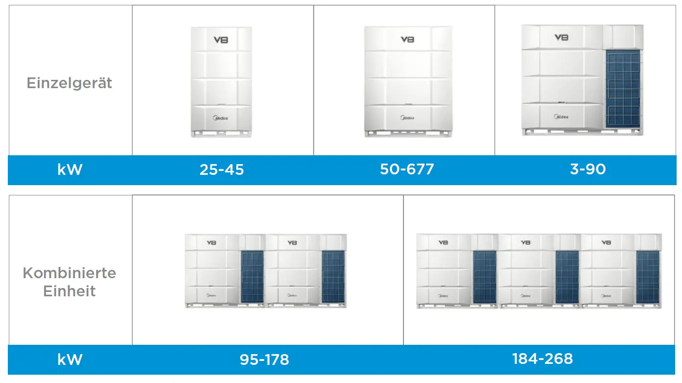 Die V8 VRF Pro kann als Einzelgerät mit Kapazitäten von 25 bis 90 kW eingesetzt werden. Zusätzlich ist es möglich, mehrere Einzelgeräte miteinander zu kombinieren, sodass Gesamt-Kapazitäten bis zu 270kW ermöglicht werden.